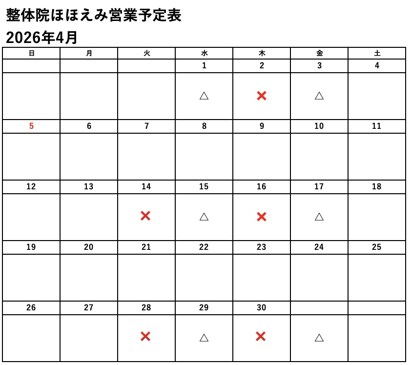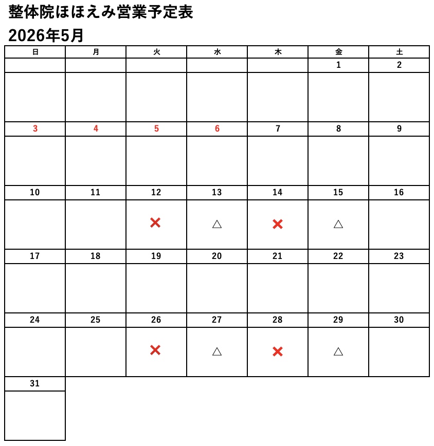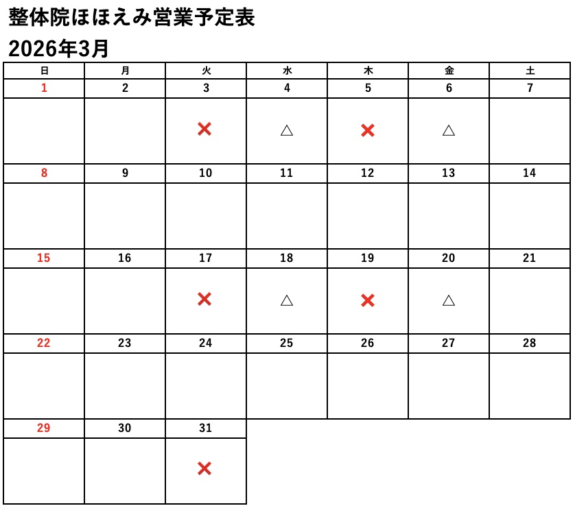 休みの日も夕方以降なら施術可。❌の日は避ける事をお勧めします。